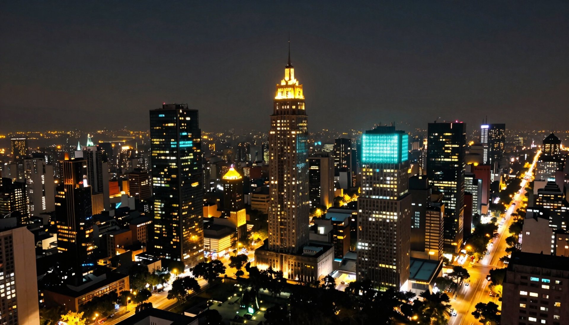 An wide-angle architectural shot of a modern business center in Mexico City. North American / Mexican professionals are seen walking through a bright, sun-lit lobby. The color palette includes light off-white and bright cyan reflections.